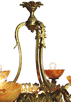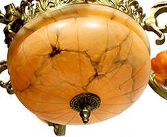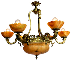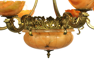 A French Early 20th Century Art Deco Bronze and Carved Veined Alabaster Six-Light Chandelier. The circular silvered frame suspended by three scrolled braces with acanthus decorations, with six scrolled shaped arm-lights, all fitted with carved alabaster shades, the center supporting a large carved alabaster plafonnier with two interior lights and an acorn shaped finial. Circa: Paris, 1920-1930.