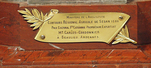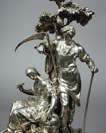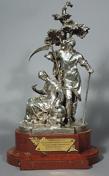 A Very Fine French 19th Century Silvered Bronze Sculpture of a Group of Farmers, an Cultural Award by Christofle & Cie. given by Le ministère de l'Agriculture in 1886. Raised on a Rouge Royal marble plinth. Serial No.: 1304241