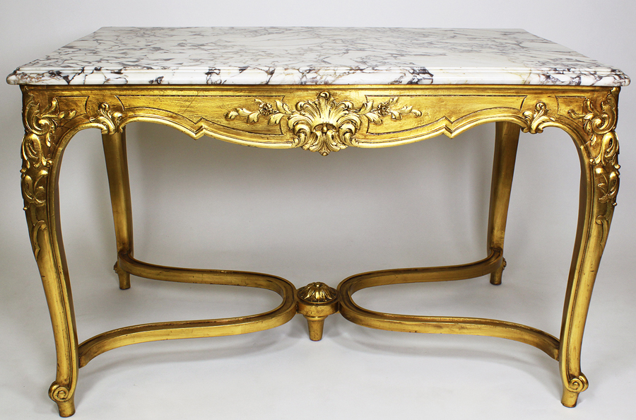 A French Early 20th Century Louis XV Style Gildwood Carved Center Table with Veined White Marble Top. Circa: Paris, 1920.