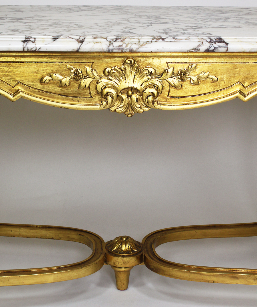 A French Early 20th Century Louis XV Style Gildwood Carved Center Table with Veined White Marble Top. Circa: Paris, 1920.