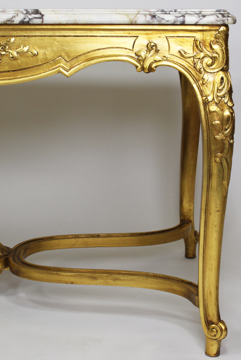 A French Early 20th Century Louis XV Style Gildwood Carved Center Table with Veined White Marble Top. Circa: Paris, 1920.