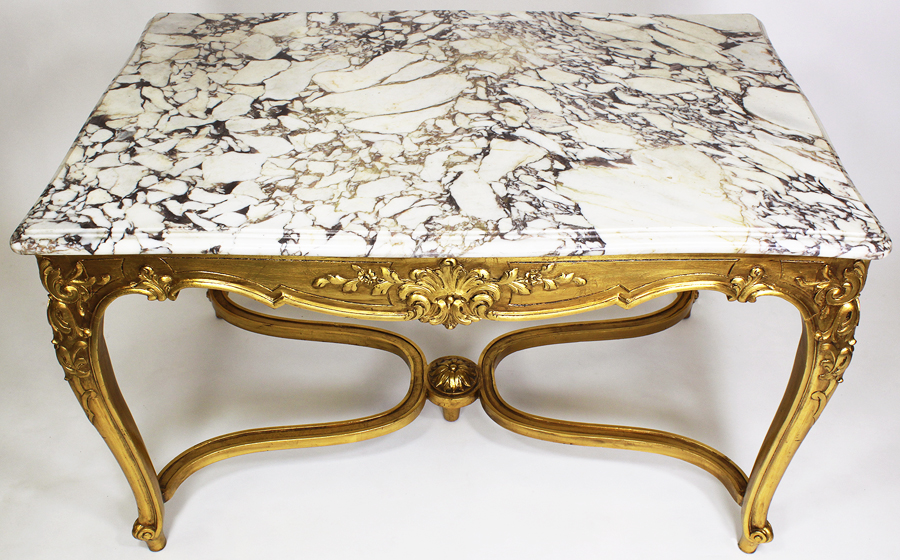 A French Early 20th Century Louis XV Style Gildwood Carved Center Table with Veined White Marble Top. Circa: Paris, 1920.