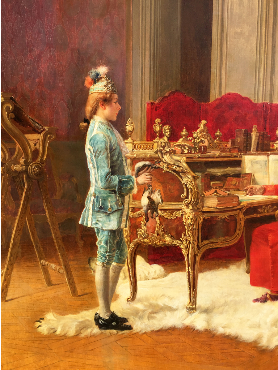 Charles Edouard Edmond Delort (French, 1841-1895) Oil on Canvas "Game for the Cardinal", depicting a seated Cardinal behind an ornate French Louis XV Roll-Top Bureau du Roi, after the model by Jean-François Oeben currently at Versailles, a young boy delivering a game bird as a gift. The ornately decorated period room is most likely a room at the Vatican, within a gildwood carved frame. Signed (Lower left): C. Delort