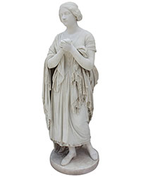 "Highland Mary" (also known as Highland Mary or a portrait of Mary Campbell) Carved White Marble Sculpure by Benjamin Edward Spence (British, 1822–1866). A fine full-length, life-size neoclassical carved statue depicts the subject of Robert Burns’s poem Highland Mary (Mary Campbell), shown as a young woman standing in a contemplative pose. The sensual carved figure with a gentle contrapposto stance, weight resting on her left leg, right foot slightly advanced, and her head tilted downward with a solemn, introspective gaze. Her hair is centrally parted and styled in soft classical waves framing the face. She wears a long, fitted floor-length gown with a buttoned bodice and full skirt falling in graceful folds, over which is draped an asymmetrically arranged, heavily fringed plaid shawl (tartan implied through carved texture). Both hands are clasped together at her chest in a reflective gesture, fingers gently interlaced. She wears simple low-heeled slippers. The sculpture stands on a plain circular marble plinth. The work exhibits the refined carving and smooth finish characteristic of Spence’s mid-19th-century neoclassical style, with particular attention to the soft drapery, fringe details, and textural contrast between fabric and skin. Multiple versions of Highland Mary are known (including examples in the Royal Collection, Walker Art Gallery, Liverpool, and Sefton Park Palm House), with minor variations in pose and attributes; Signed: B.E. SPENCE Ft. ROMAE - 1862. Ref.: A2885 - Lot 10078 |